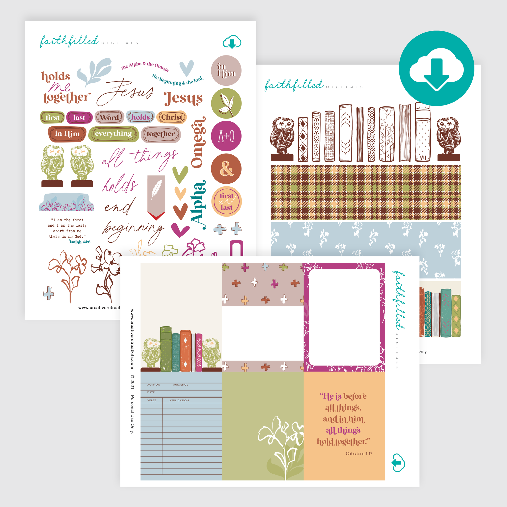 These printables feature a warm, retro color palette and hand-drawn elements. This printable set coordinates with the "Alpha & Omega" devotional also available as a digital download.