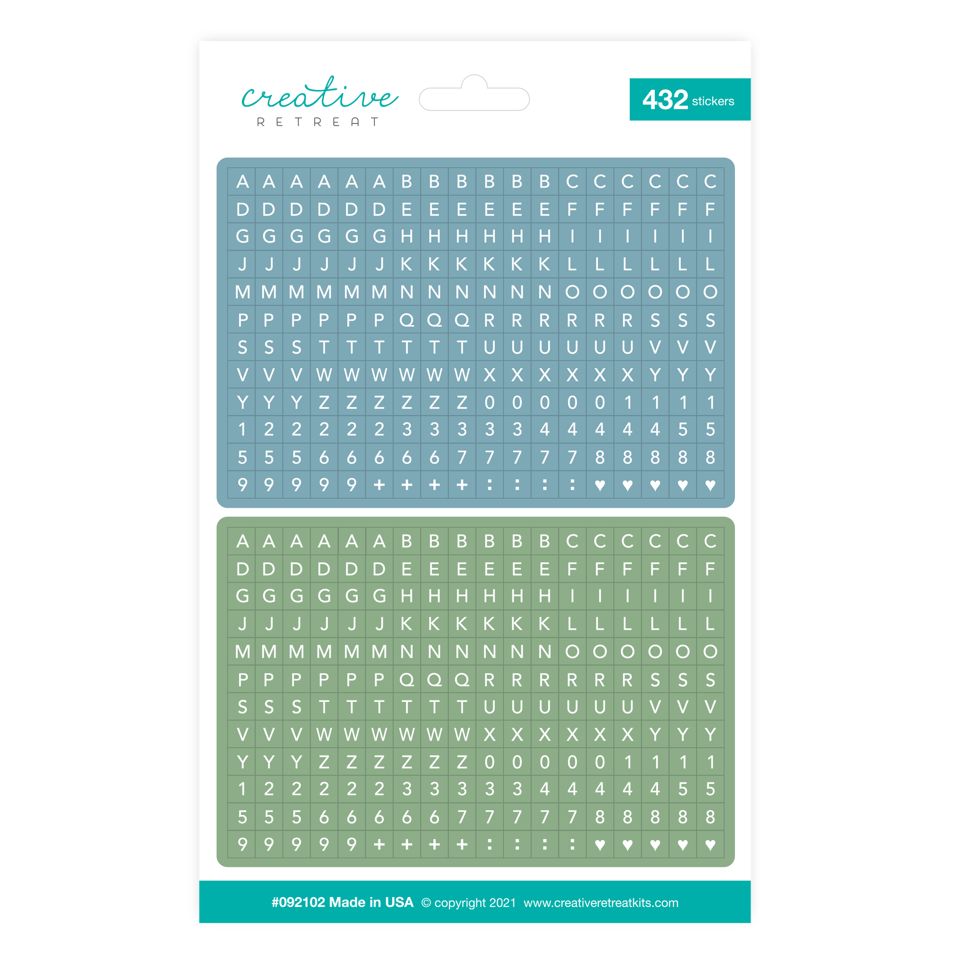 One 5” x 8” sheet of uncoated, cardstock alphabet stickers. Individual letter tiles are approximately 1/4” tall.