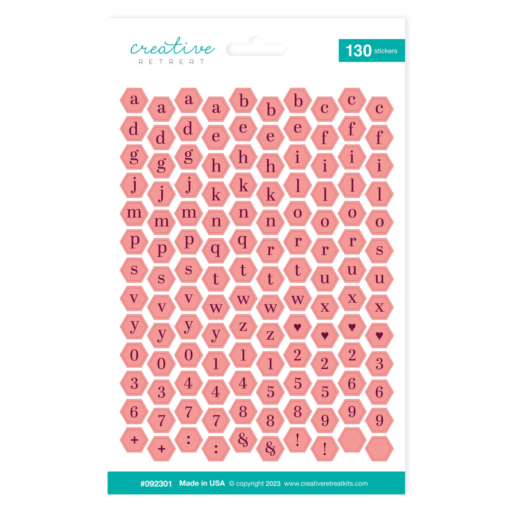 One 5” x 8” sheet of uncoated, cardstock alphabet stickers. Individual hexagons are approximately 3/8” tall.