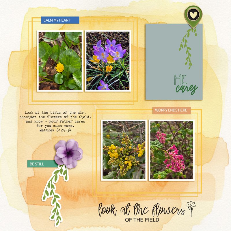 Breathe peace into your pages with Flowers of the Field Kit, a faith-inspired digital scrapbooking collection centered on worship, trust, and letting go of worry. A joyful palette of spring greens, cobalt blue, and gentle lavender will inspire your memory keeping AND faith-filled reflective journaling. Includes a bonus PDF devotional to get your Bible study on!