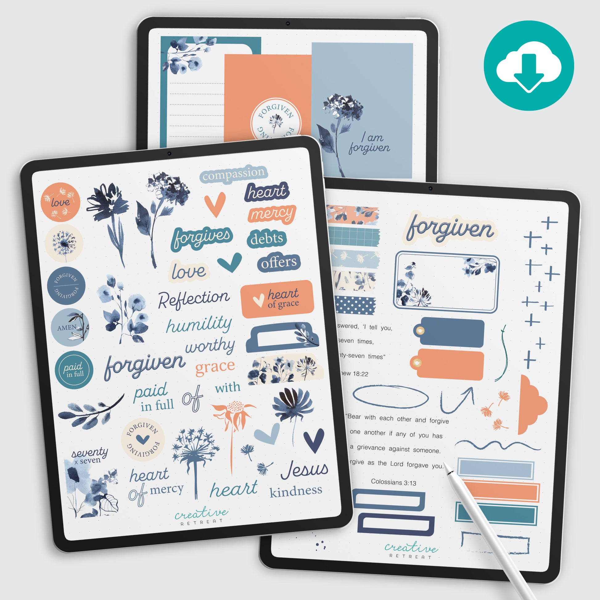 Digital Bible journalers, you're invited to join our creative Bible study! Download the "Forgiven" art elements and coordinating devotional to create your own responsive entries in a digital Bible. Ideally packaged for GoodNotes.