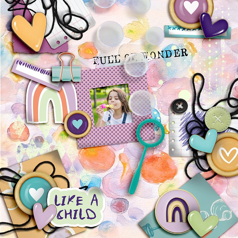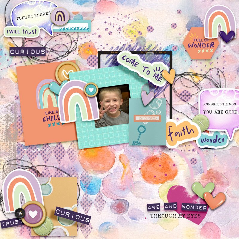 Full of Wonder Kit is a faith-filled digital scrapbooking kit inspired by childlike trust, curiosity, and wholehearted dependence on God. With layered textures, soft watercolor details, dimensional bubbles, hand-drawn marks, and meaningful word art, this kit invites you to document moments of faith, growth, and seeing the world through wonder-filled eyes.