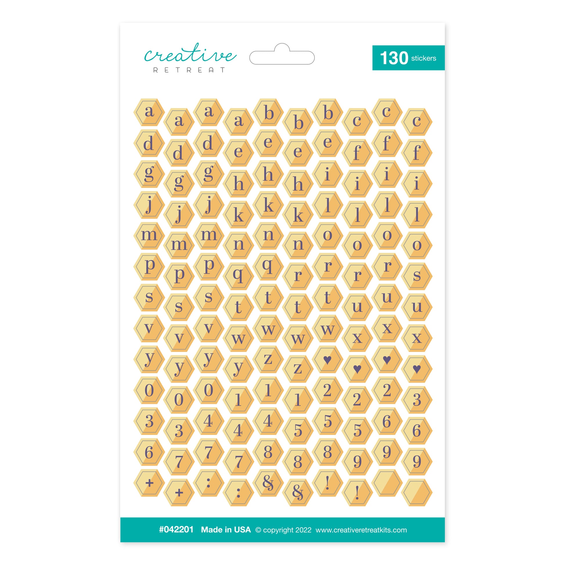 One 5” x 8” sheet of uncoated, cardstock alphabet stickers. Individual yellow hexagons are approximately 3/8” tall.