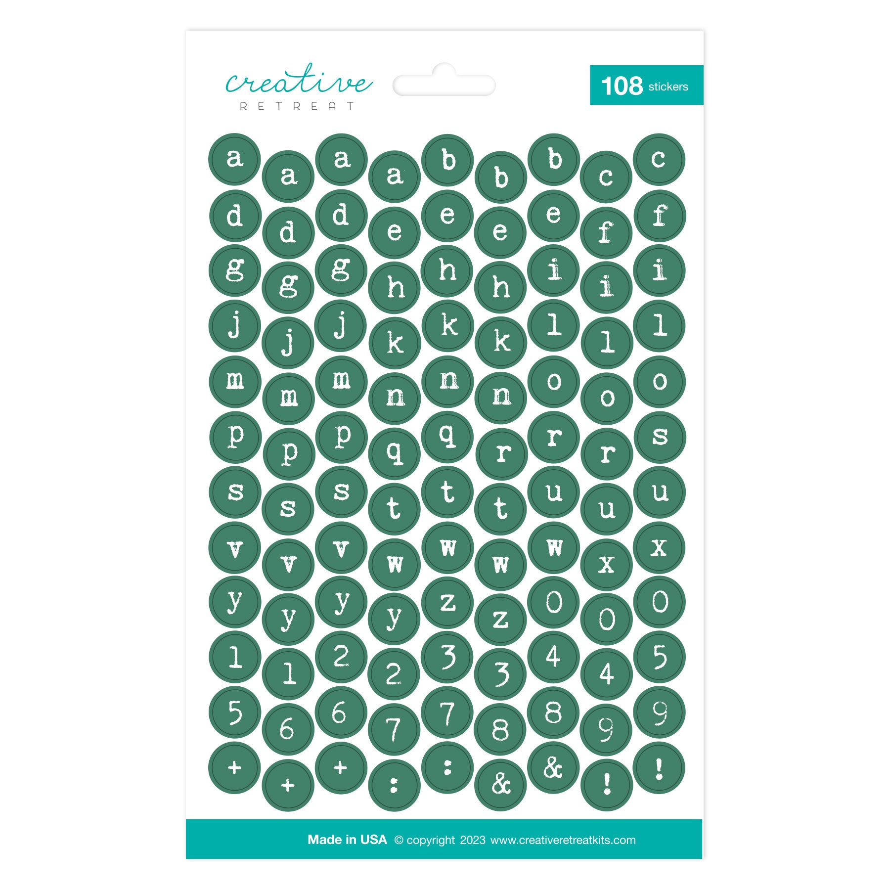 One 5” x 8” sheet of emerald green, uncoated, cardstock alphabet stickers. Circles are approximately 7/16” in diameter.