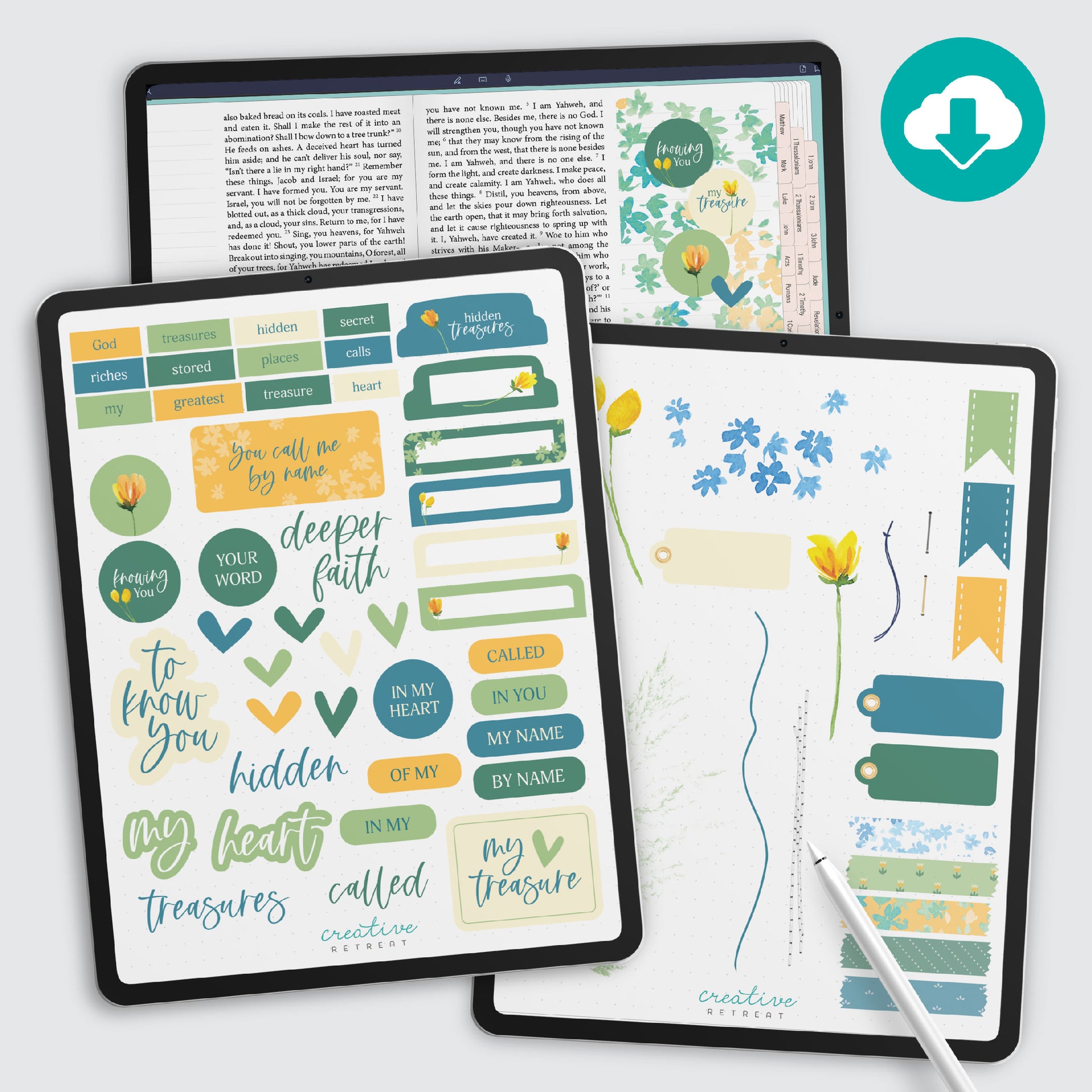 Digital Bible journalers, you're invited to join our creative Bible study! Download the "Hidden Treasures" art elements and coordinating devotional to create your own responsive entries in a digital Bible. Ideally packaged for GoodNotes.