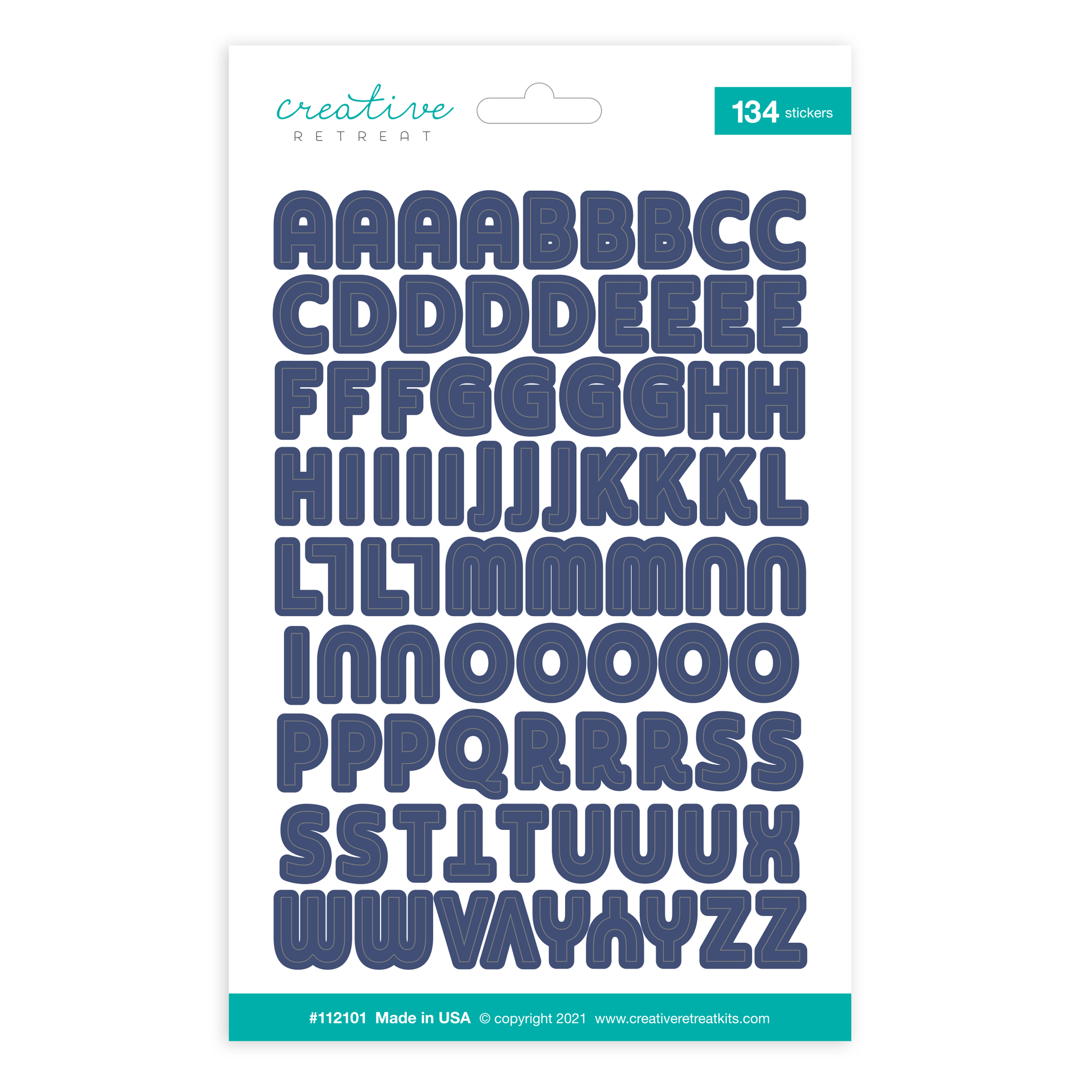 One 5” x 8” sheet of cardstock alphabet stickers. Individual navy letters are approximately 1/2” tall.