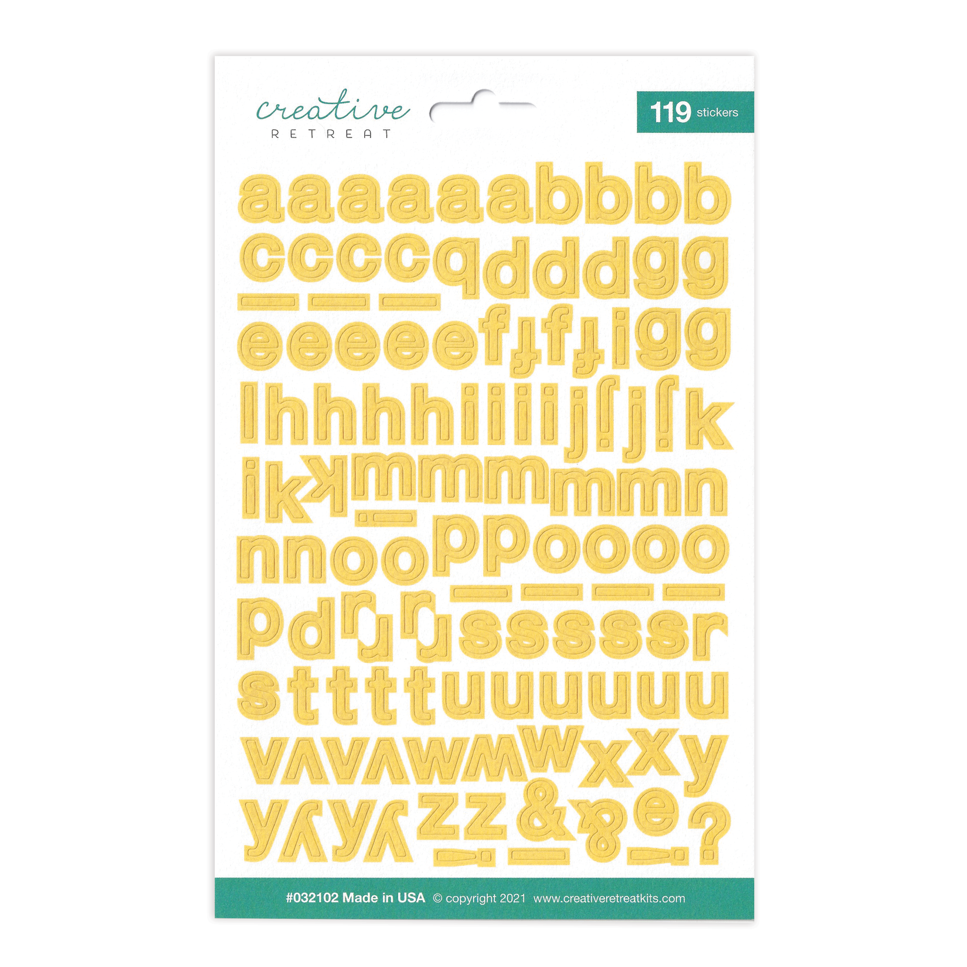 One 5” x 8” sheet of uncoated, yellow cardstock alphabet stickers. Lowercase “a” is approximately 3/8” tall.