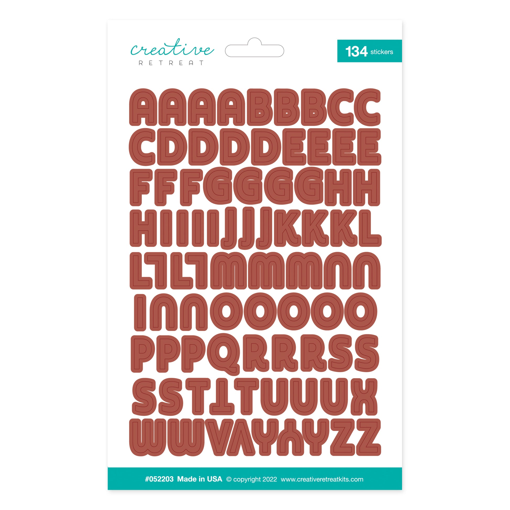 One 5” x 8” sheet of cardstock alphabet stickers. Individual deep terra cotta letters are approximately 1/2” tall.