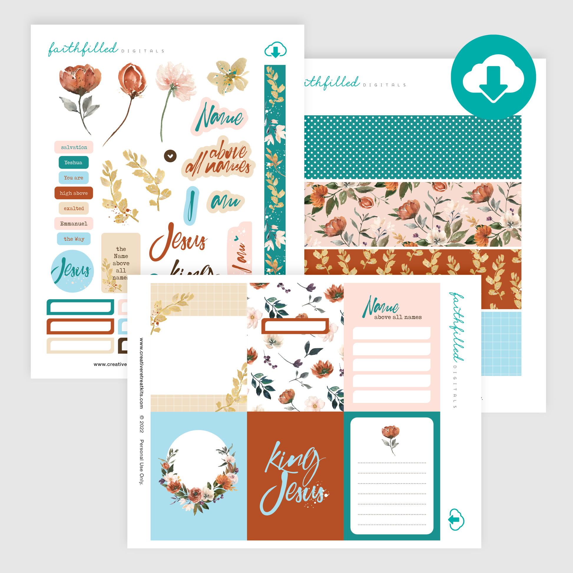 Featuring watercolor florals and hand-lettered titles, this printable set coordinates with the "Name above all names" devotional also available as a digital download.