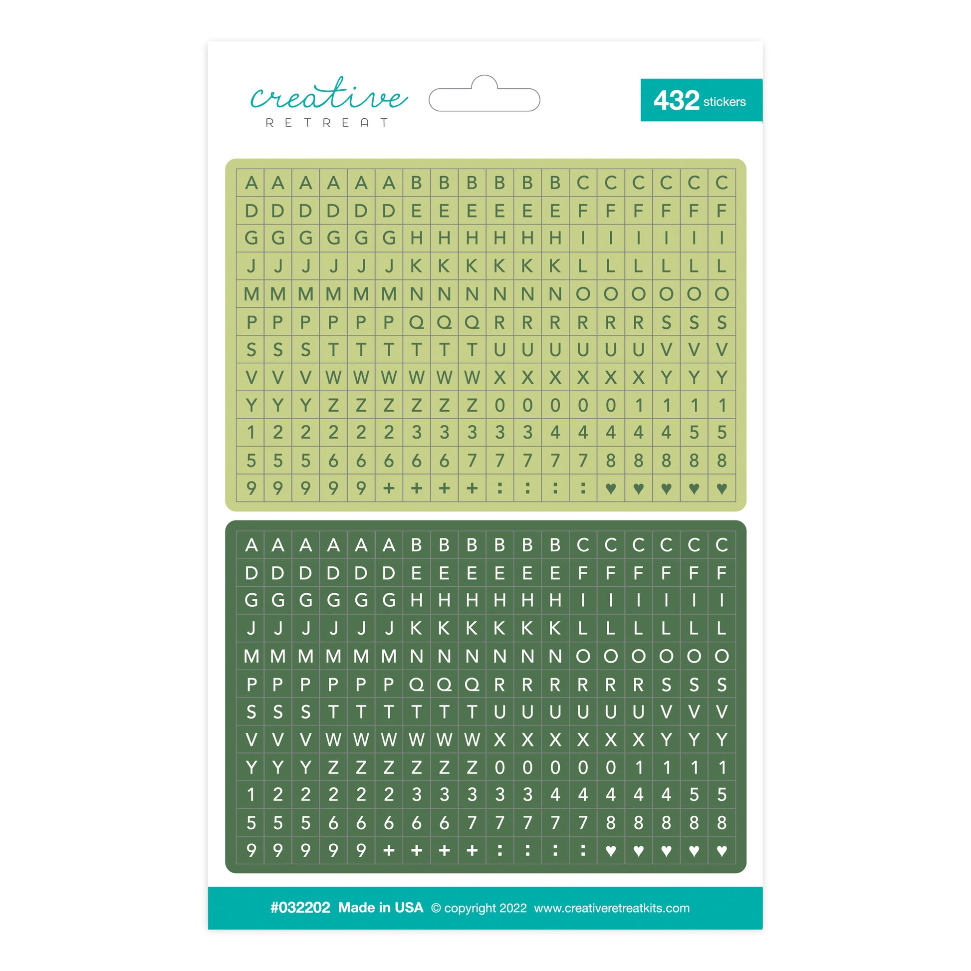 One 5” x 8” sheet of uncoated, cardstock alphabet stickers in two shades of green. Individual letter tiles are approximately 1/4” tall.