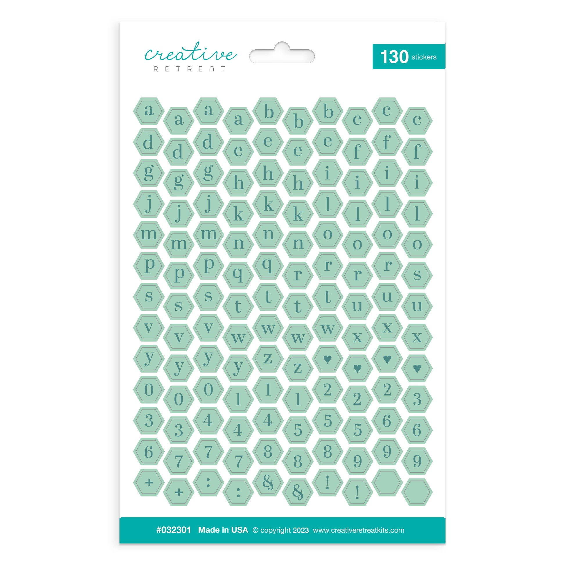One 5” x 8” sheet of uncoated, cardstock alphabet stickers. Individual hexagons are approximately 3/8” tall.