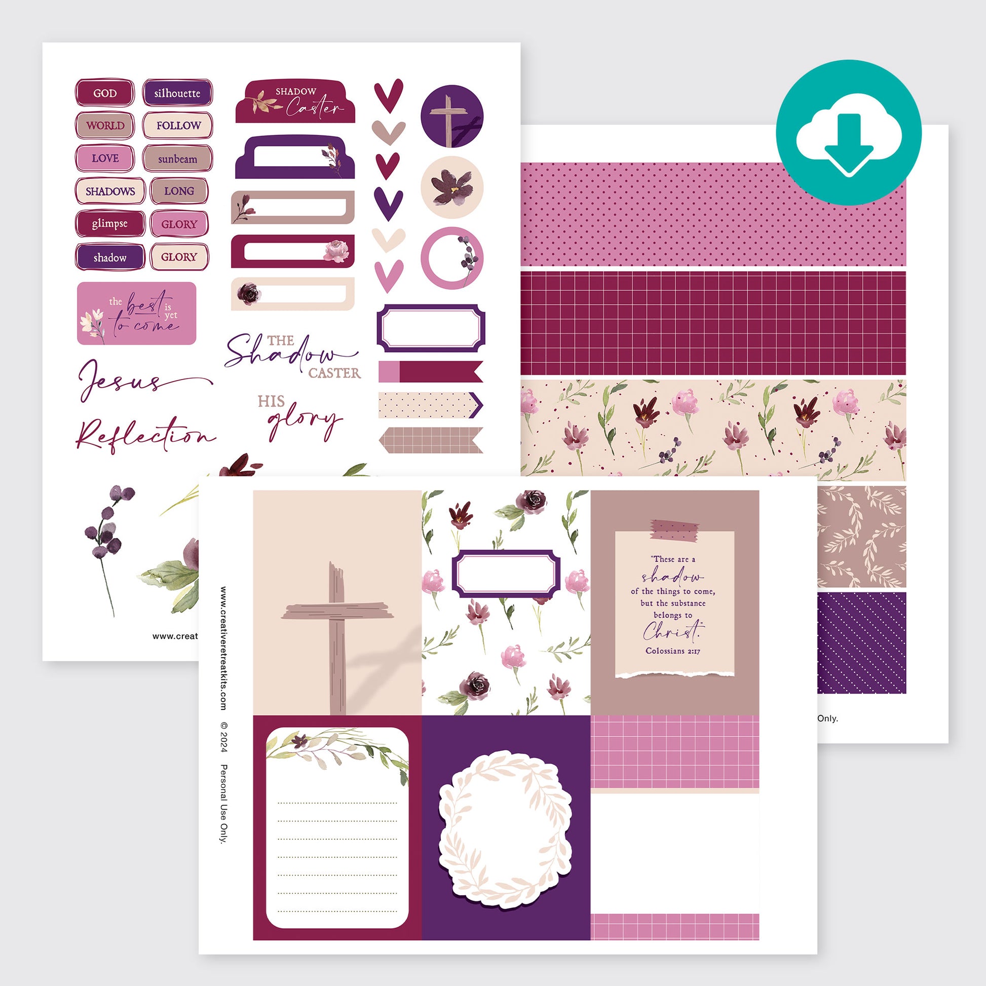 With rich colors and beautiful florals, these printable journaling cards, embellishments, and patterned paper swatches perfectly coordinate with the "Shadow Caster" devotional also available as a digital download.