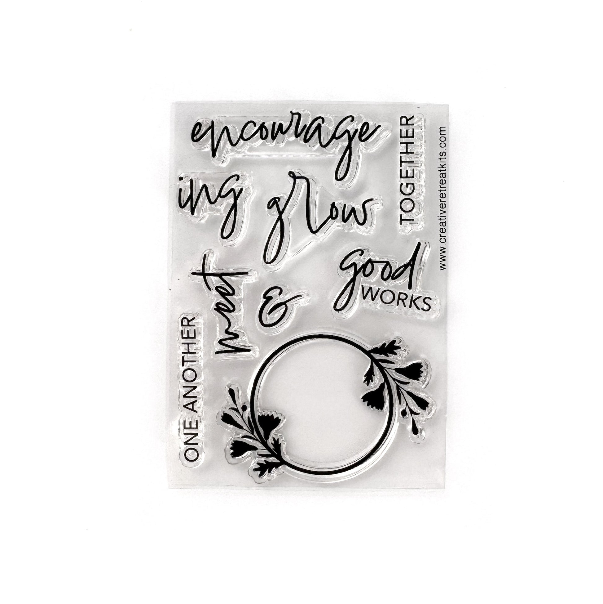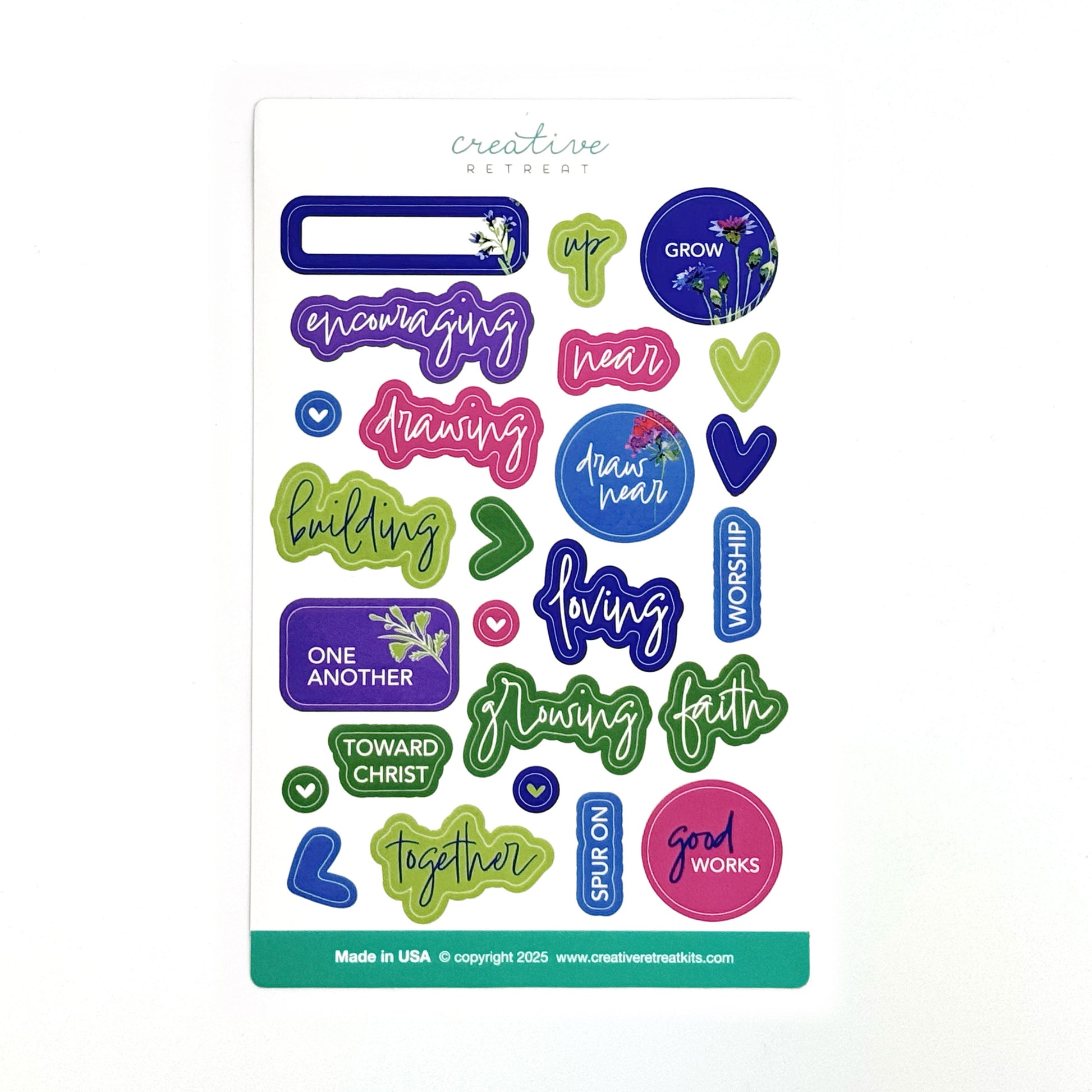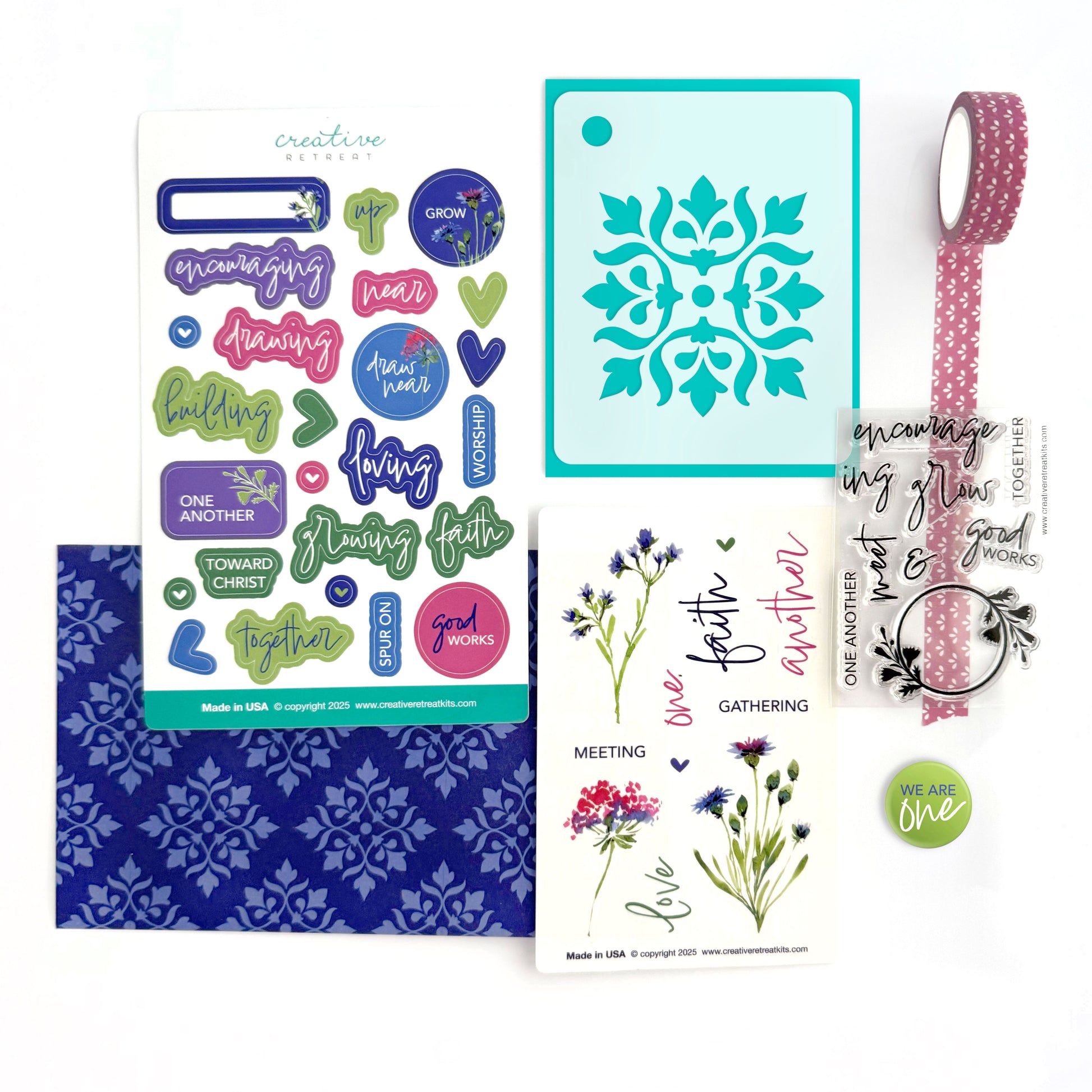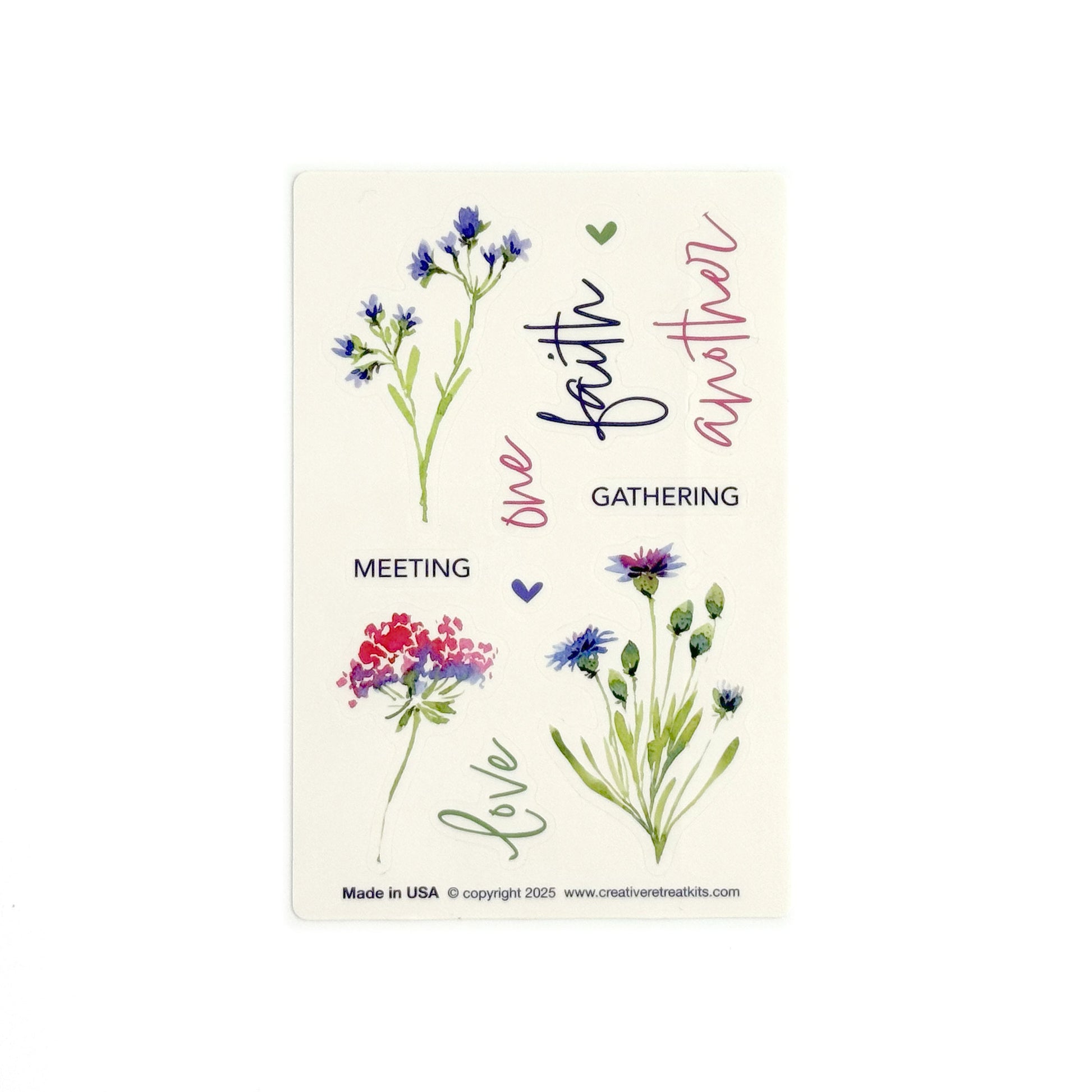 Join us for a creative Bible study with fun handwritten titles, bold colors, and watercolor flowers! The art nouveau inspired stencil creates a bold backdrop for your reflective entries while the clear stickers will look like you painted directly on your page! The glossy decor stickers and stamp set will help create a bold statement as you dive into the devotional and scripture study.