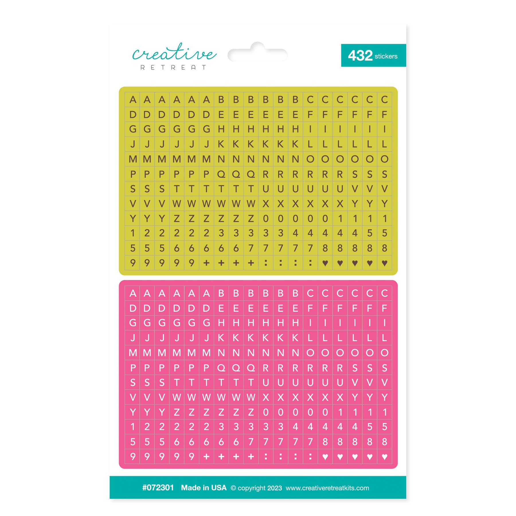 One 5” x 8” sheet of uncoated, cardstock alphabet stickers. Individual letter tiles are approximately 1/4” tall.