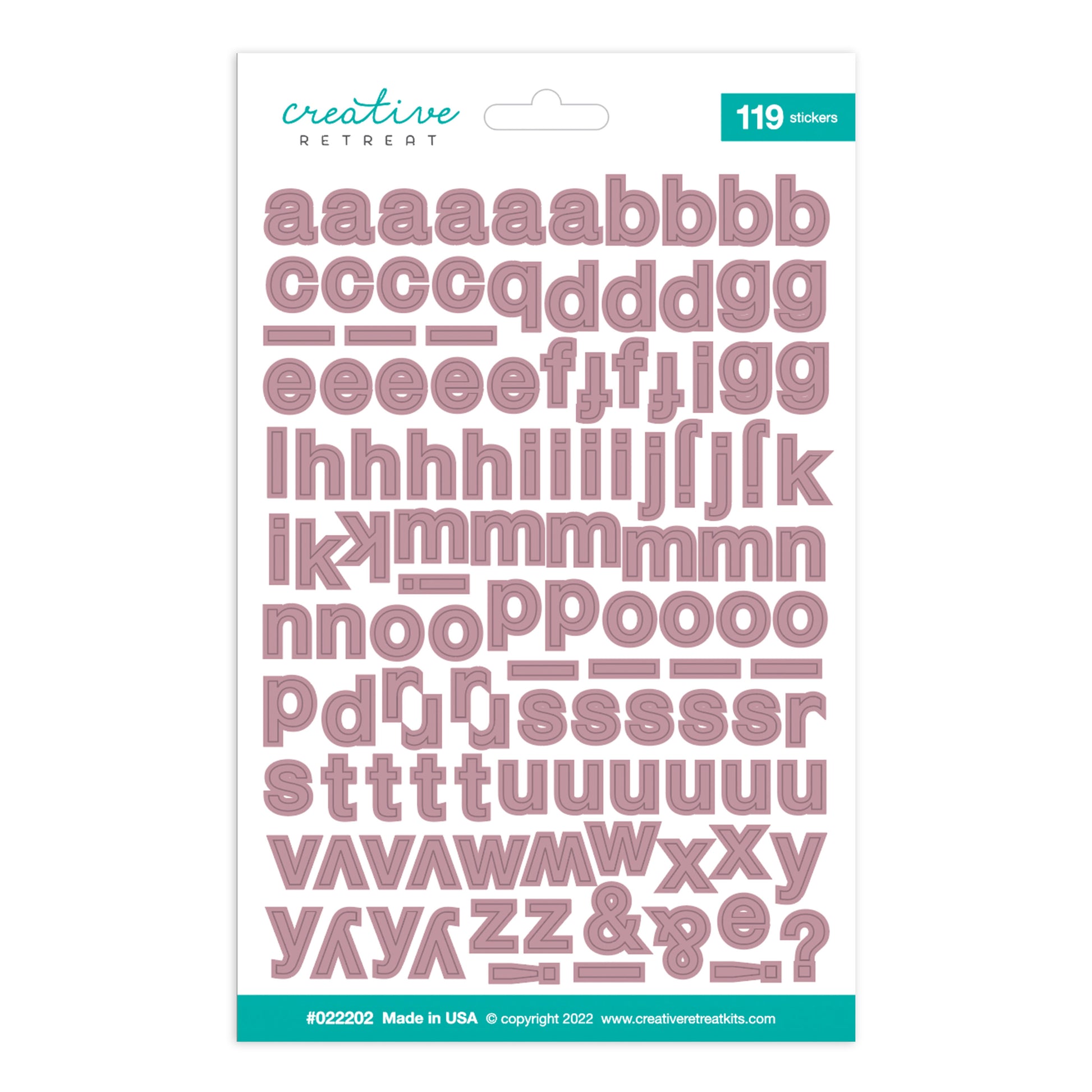 One 5” x 8” sheet of uncoated, rose cardstock alphabet stickers. Lowercase “a” is approximately 3/8” tall.